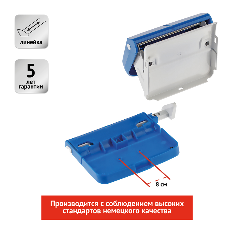 Удобный дырокол для использования в офисе и дома. Изготовлен из высококачественного пластика со съемным контейнером, предохраняющим поверхность стола от царапин. Имеет выдвижную линейку с хорошо читаемой шкалой форматов и надежной фиксацией упора. Расстояние между отверстиями 80мм, диаметр отверстий 5,5мм. Яркий и насыщенный синий цвет гармонично впишется в интерьер рабочего пространства.