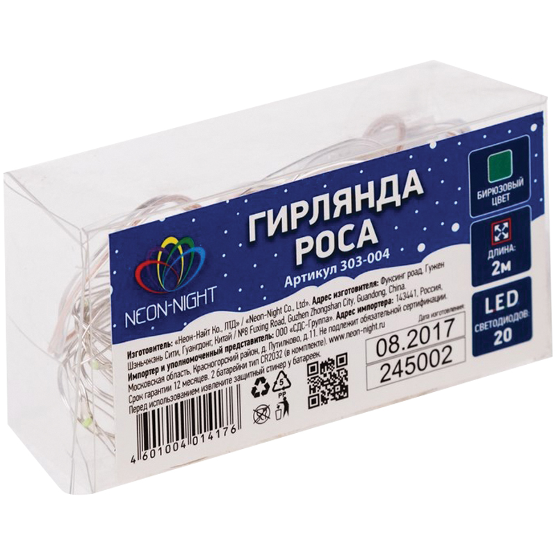 Гирлянда светодиодная "Роса" состоит из тонкого провода длиной 2 м с расположенным на нем 20 светодиодами бирюзового цвета свечения, а также батарейного блока. Блок крепится на дополнительный провод 30 см. Питание осуществляется при помощи 3 батареек типа AA. Данная гирлянда найдет свое применение в дизайнерских решениях внутри помещений при украшении предметов интерьера, растений и даже букетов цветов.