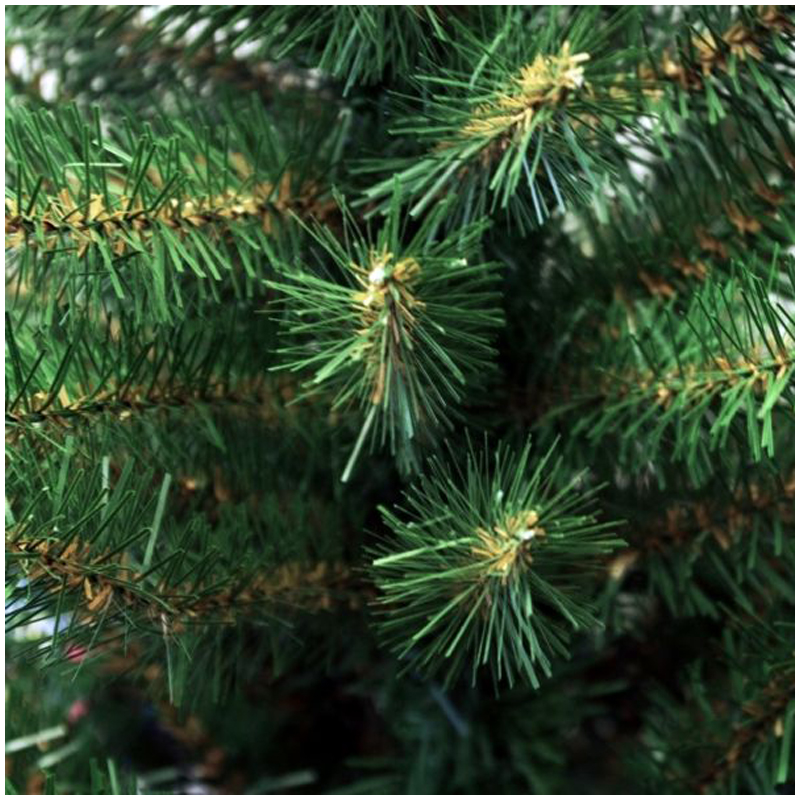 Крона в виде широкого конуса, размах нижних веток 840 мм, светло-зеленый цвет, хвоя - пленка ПВХ, длина хвоинки 25 мм, ветви жестко прикреплены к стволу, отгибаются движением руки, количество веток 316 шт.