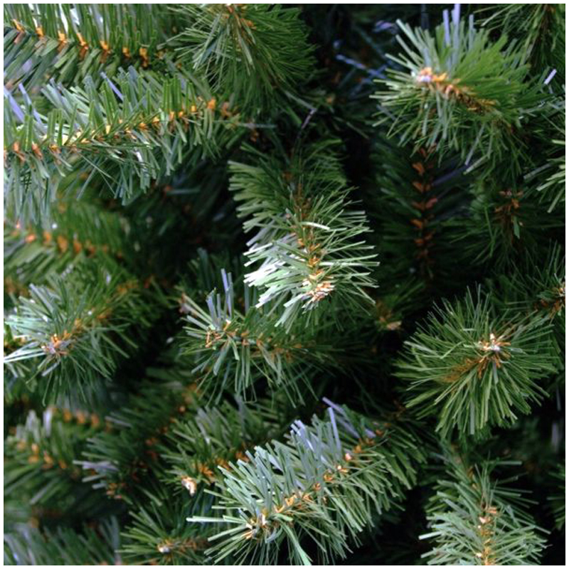 Крона овальной формы, размах нижних веток 1180 мм, темно-зеленый цвет, хвоя - пленка ПВХ, длина хвоинки 30 мм, ветви жестко прикреплены к стволу, отгибаются движением руки, количество веток 805 шт.