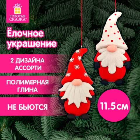 Размер украшения - 6х12 см. Материал - полимерная глина. Каждое елочное украшение имеет бумажную этикетку и упаковано в воздушно-пузырчатую плёнку для защиты от повреждений. Поставляется в 2 дизайнах (без возможности выбора).