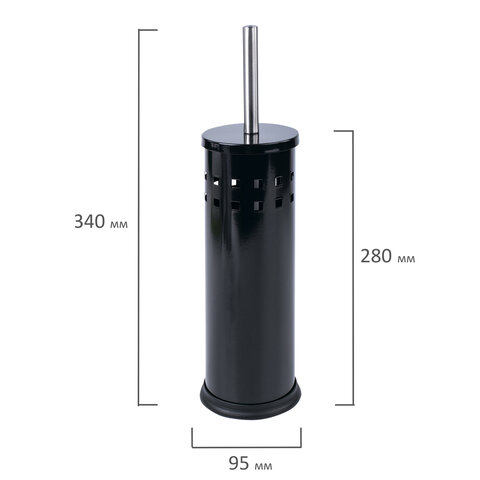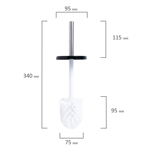 Изготовлен из зеркальной нержавеющей стали. Диаметр подставки - 9,5 см. Диаметр щетки - 7,5 см. Высота - 34 см.