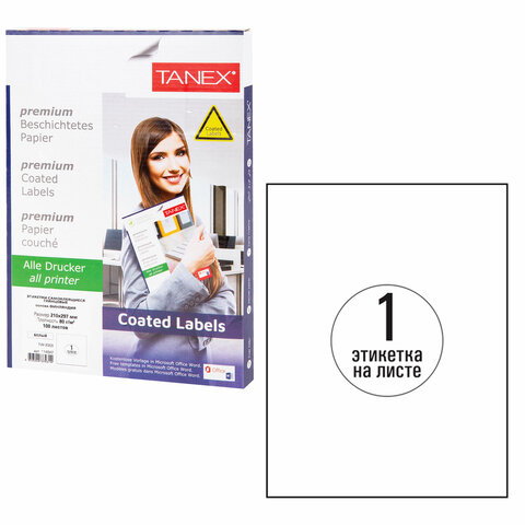 Этикетка самоклеящаяся ГЛЯНЦЕВАЯ 210х297 мм, 1 этикетка, белая, 80 г/м2, 100 листов, TANEX, сырье Финляндия, 114547, TW-2000