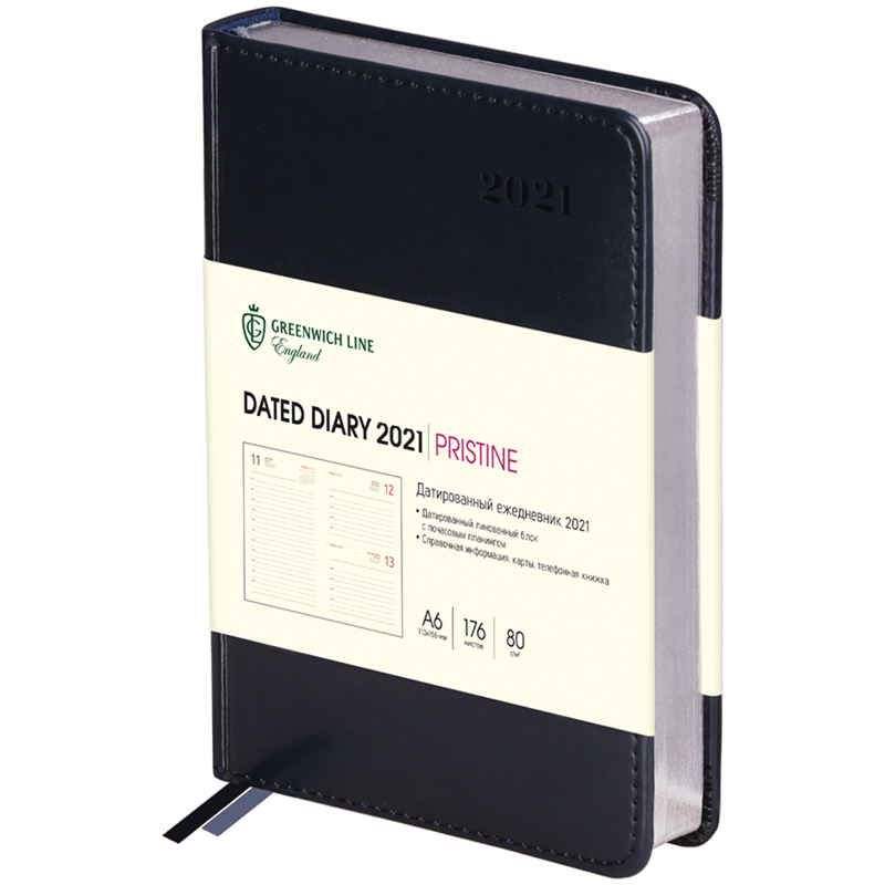 Ежедневник датир. 2021г., A6, 176л., кожзам, Greenwich Line "Pristine", черный, серебр. срез