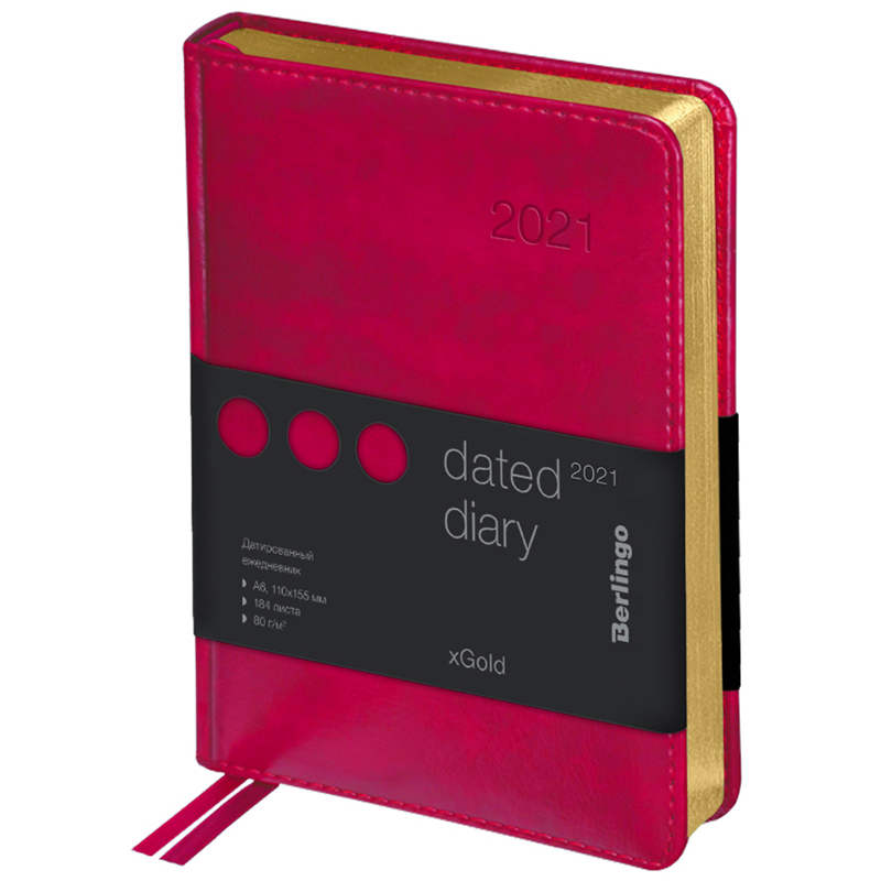 Ежедневники Berlingo xGold изготовлены из глянцевого рельефного кожзаменителя, имитирующего кожу первоклассной выделки. Ежедневник датированный формата A6 (115*160 мм) с обложкой с поролоновой прослойкой. Золотой фольгированный срез блока. 184 листа. Цвет обложки - фуксия. Высококачественная кремовая бумага повышенной плотности 80 г/м2, пантонная печать блока в 2 краски, справочный материал, географические карты на форзацах. Перфорированные уголки блока. 2 закладки-ляссе. Отрывные заметки. В подарок 3 комплекта стикеров.