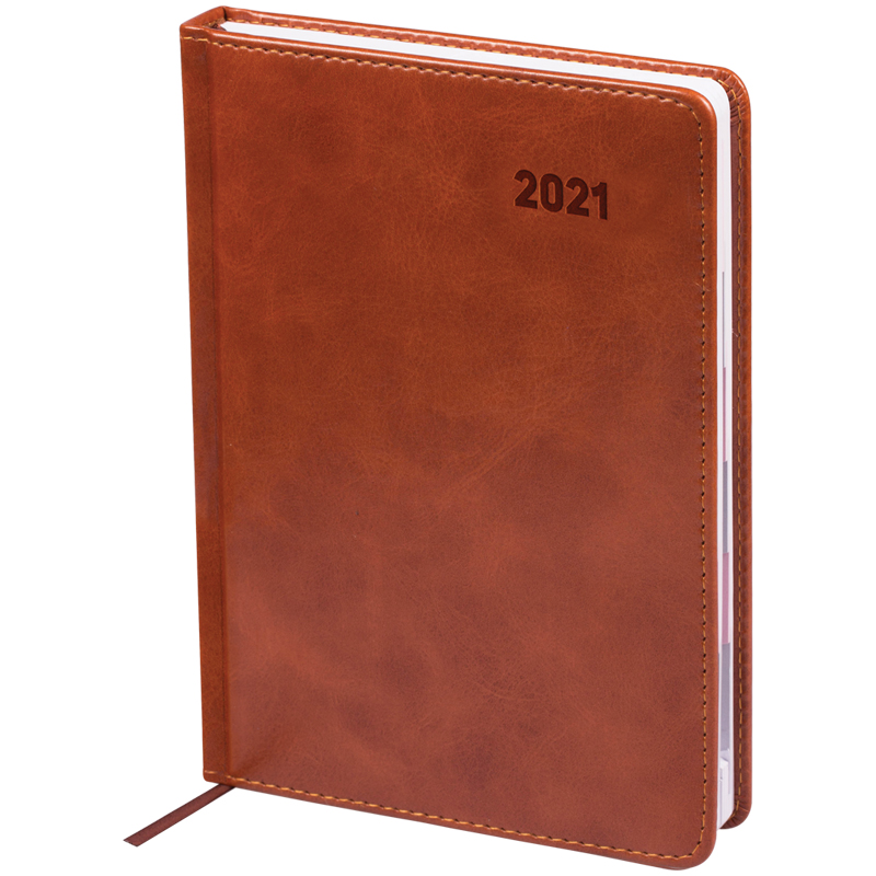 Ежедневник датированный формата А5 из коллекции «Vesper Index», с индексной вырубкой. Обложка изготовлена из высококачественного кожзаменителя, имитирующего натуральную полуматовую кожу, с поролоновой прослойкой, цвет обложки - коричневый. Подходит для всех видов полиграфического тиснения. Внутренний блок состоит из 176 листов офсетной бумаги плотностью 70 г/м2, печать блока в 2 краски, справочный материал. На форзацах географические карты России и Мира. Удобная закладка-ляссе и перфорированные уголки.