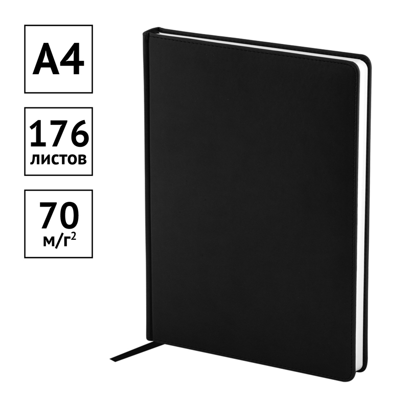 Стильный датированный ежедневник на 2024 год OfficeSpace формата А4 серии Winner станет отличным помощником в планировании дел. Ежедневник имеет размер 210*295 мм. Внутренний блок – 176 листов офсетной белой бумаги плотностью 70 г/м2 с печатью в 2 краски. Обложка с поролоновой прослойкой изготовлена из высококачественной экокожи чёрного цвета с гладкой мягкой матовой поверхностью. Подходит для всех видов полиграфического тиснения. Перфорированные скруглённые уголки и закладка-ляссе обеспечат комфорт и удобство при использовании ежедневника. Внутри есть полезный справочный материал. Датированный ежедневник подходит под персонализацию. Изделие имеет индивидуальную упаковку.<br/>• Формат: А4;<br/>• Размер: 210*295 мм;<br/>• Количество листов: 176;<br/>• Материал обложки: экокожа; <br/>• Цвет обложки: чёрный.