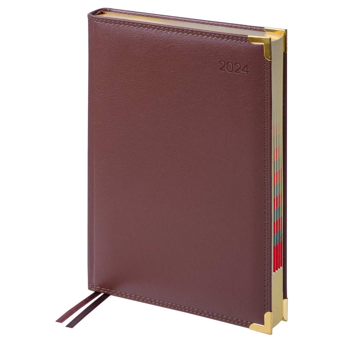 Изысканный датированный ежедневник Delucci формата B5 (175*250 мм) − элегантный помощник для планирования. Обложка ежедневника с поролоновой прослойкой изготовлена из премиальной рельефной экокожи, имитирующей кожу первоклассной выделки, и прошита двойной строчкой. Цвет обложки − коричневый. Изделие дополняют золотые металлические уголки и золотой фольгированный срез блока.