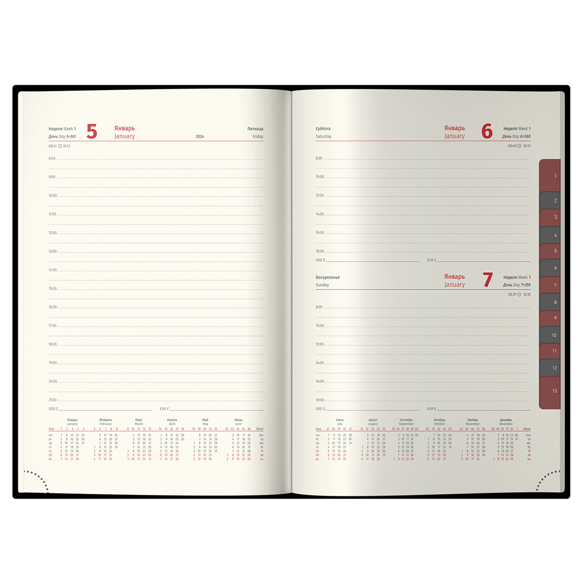 Внутренний блок состоит из 184 листов высококачественной кремовой бумаги повышенной плотности 80 г/м2 с пантонной печатью блока в 2 краски. Блок имеет перфорированные уголки. Справочный материал, 2 удобных закладки-ляссе, отрывные заметки, бланки-извещения о ДТП и вырубной блок по неделям гарантируют комфорт при использовании ежедневника. Изделие подходит под персонализацию. Упаковано в подарочную матовую индивидуальную упаковку. Обладателя ежедневника также порадуют 3 комплекта стикеров в подарок.