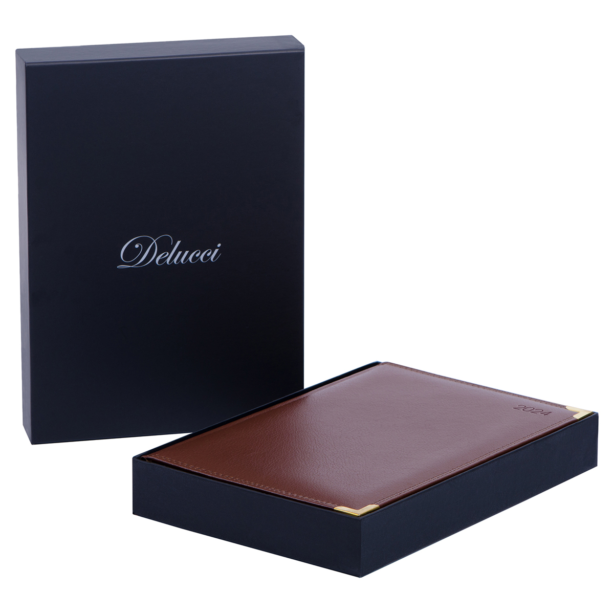 Изысканный датированный ежедневник Delucci формата B5 (175*250 мм) − элегантный помощник для планирования. Обложка ежедневника с поролоновой прослойкой изготовлена из премиальной рельефной экокожи, имитирующей кожу первоклассной выделки, и прошита двойной строчкой. Цвет обложки − коричневый. Изделие дополняют золотые металлические уголки и золотой фольгированный срез блока.<br/>Внутренний блок состоит из 184 листов высококачественной кремовой бумаги повышенной плотности 80 г/м2 с пантонной печатью блока в 2 краски. Блок имеет перфорированные уголки. Справочный материал, 2 удобных закладки-ляссе, отрывные заметки, бланки-извещения о ДТП и вырубной блок по неделям гарантируют комфорт при использовании ежедневника. Изделие подходит под персонализацию. Упаковано в подарочную матовую индивидуальную упаковку. Обладателя ежедневника также порадуют 3 комплекта стикеров в подарок.<br/><br/>• Формат: А4 (B5);<br/>• Размер: 175*250 мм;<br/>• Количество листов: 184;<br/>• Материал обложки: экокожа.