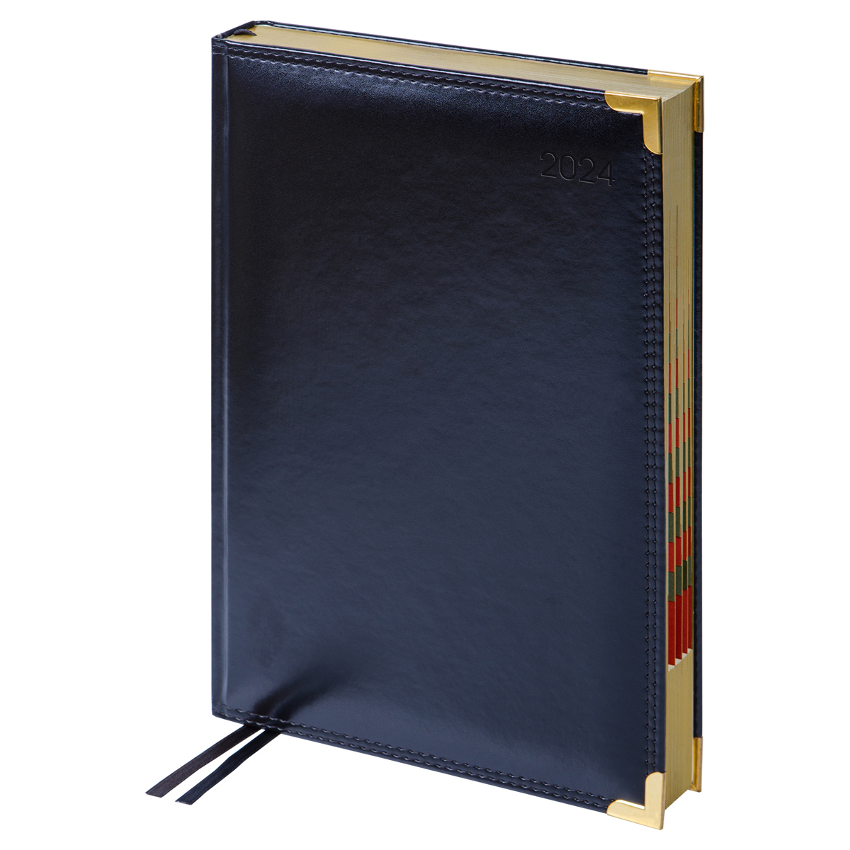 Изысканный датированный ежедневник Delucci формата B5 (175*250 мм) − элегантный помощник для планирования. Обложка ежедневника с поролоновой прослойкой изготовлена из премиальной глянцевой экокожи, имитирующей кожу первоклассной выделки, и прошита двойной строчкой. Цвет обложки − чёрный. Изделие дополняют золотые металлические уголки и золотой фольгированный срез блока.