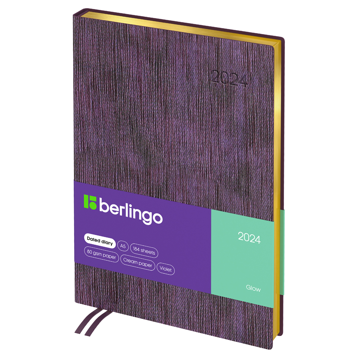 Оригинальный датированный ежедневник на 2024 год Berlingo Glow формата А5 идеально подойдет в качестве подарка. Золотой фольгированный срез красиво подчеркивает фиолетовый фактурный цвет интегральной обложки из экокожи с продольной текстурой. Внутренний блок состоит из 184 листов высококачественной кремовой бумаги повышенной плотности 80 г/м² с пантонной печатью в 2 краски. Размер недатированного ежедневника – 150*215 мм.<br/>Перфорированные уголки листов и 2 закладки-ляссе сделают использование ежедневника Berlingo Glow комфортным. Внутри располагаются: географическая карта, отрывные заметки, бланки извещения о ДТП и справочные материалы. Ежедневник на 2024 год подходит под персонализацию, а 3 комплекта стикеров станут приятным подарком.<br/>• Формат: A5;<br/>• Размер: 150*215 мм;<br/>• Количество листов: 184;<br/>• Материал обложки: экокожа;<br/>• Цвет обложки: фиолетовый.