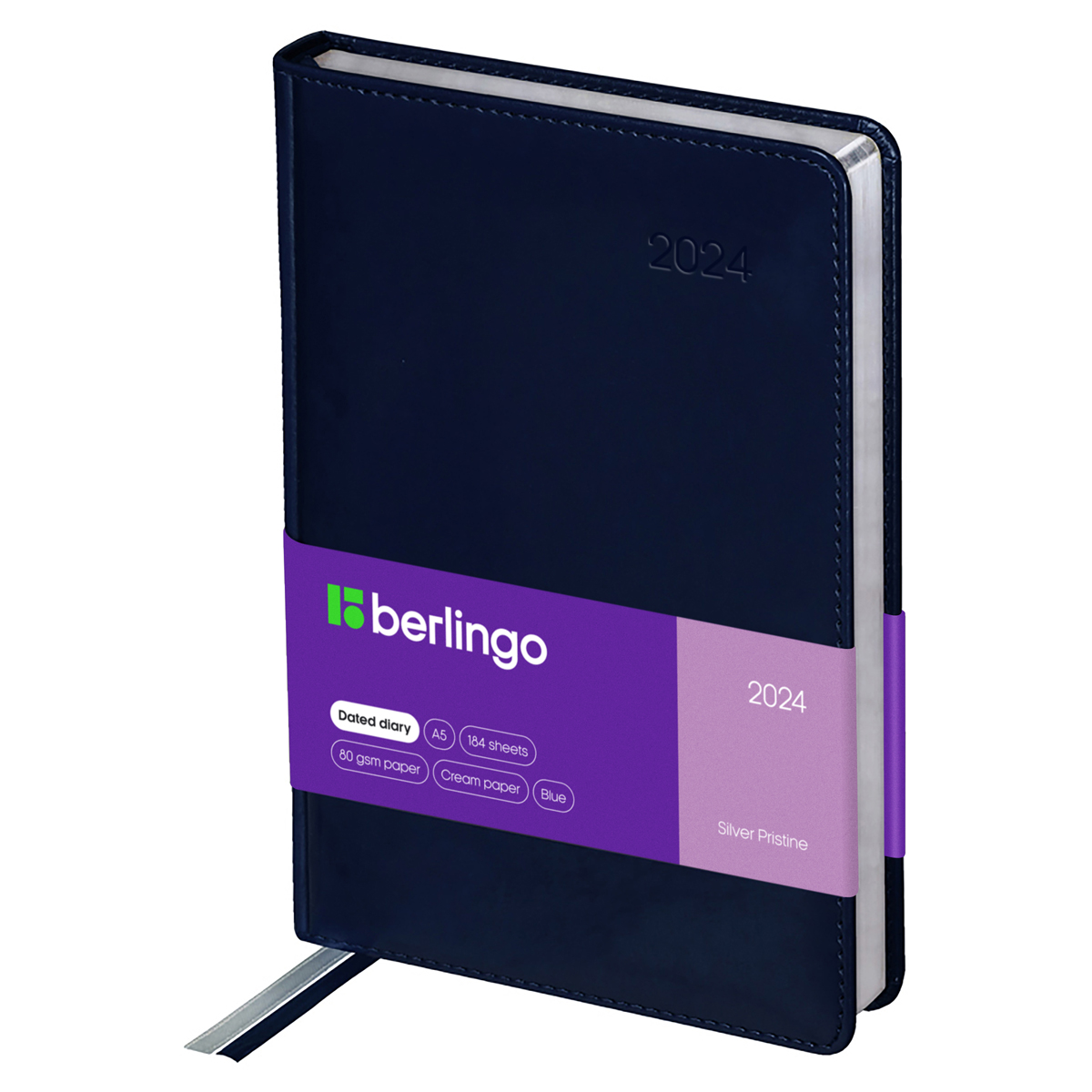 Датированный ежедневник на 2024 год Berlingo Silver Pristine формата А5 (150*215 мм) станет стильным помощником в планировании. Синяя обложка с поролоновой прослойкой и прострочкой по периметру изготовлена из глянцевой экокожи, имитирующей лакированную кожу первоклассной выделки. Её дизайн дополняет серебряный фольгированный срез внутреннего блока из 184 листов высококачественной кремовой бумаги повышенной плотности 80 г/м2 с пантонной печатью в 2 краски. На обложке есть печать года. Перфорированные уголки блока, отрывные заметки и 2 закладки-ляссе обеспечивают комфорт при использовании ежедневника. Внутри изделия есть полезный справочный материал и бланки-извещения о ДТП. В подарок 3 комплекта креативных брендированных стикеров.<br/>• Формат: А5;<br/>• Размер: 150*215 мм;<br/>• Количество листов: 184;<br/>• Материал обложки: экокожа.