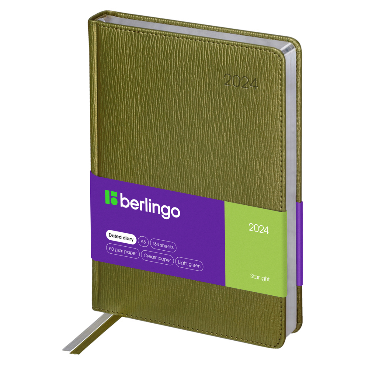 Датированный ежедневник Berlingo Starlight формата А5 (150*215 мм) − стильное решение для планирования. Обложка ежедневника с поролоновой прослойкой и прострочкой по периметру изготовлена из высококачественной экокожи с эффектом блеска и крупной продольной текстурой. Цвет обложки − салатовый. Изделие дополняет серебряный фольгированный срез внутреннего блока из 184 листов высококачественной кремовой бумаги повышенной плотности 80 г/м2 с пантонной печатью в 2 краски. Справочный материал, перфорированные уголки блока, отрывные заметки и 2 закладки-ляссе помогут комфортно использовать ежедневник. Также внутри есть бланки-извещения о ДТП. 3 дополнительных комплекта брендированных стикеров станут отличным подарком. Упакован в термоусадочную плёнку.