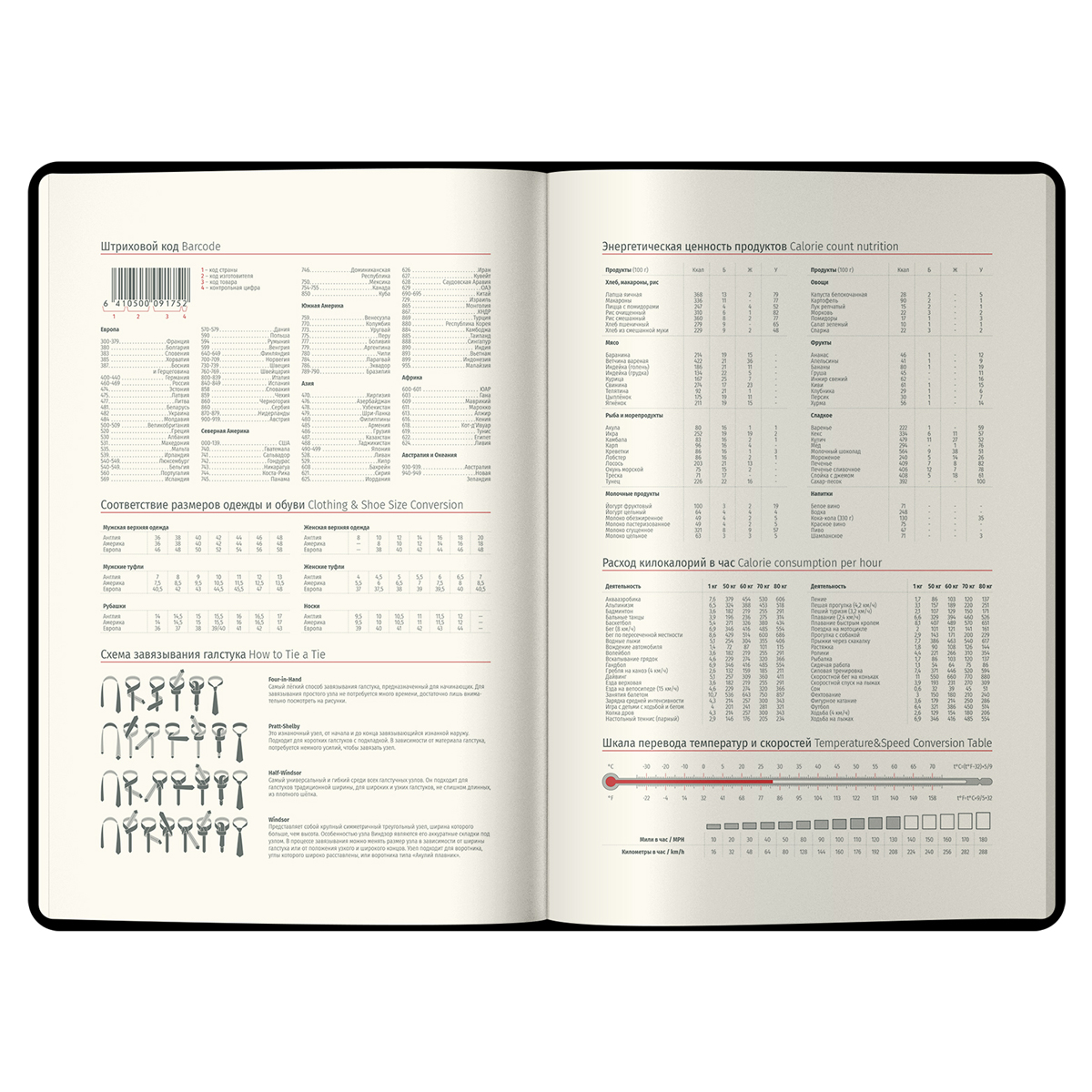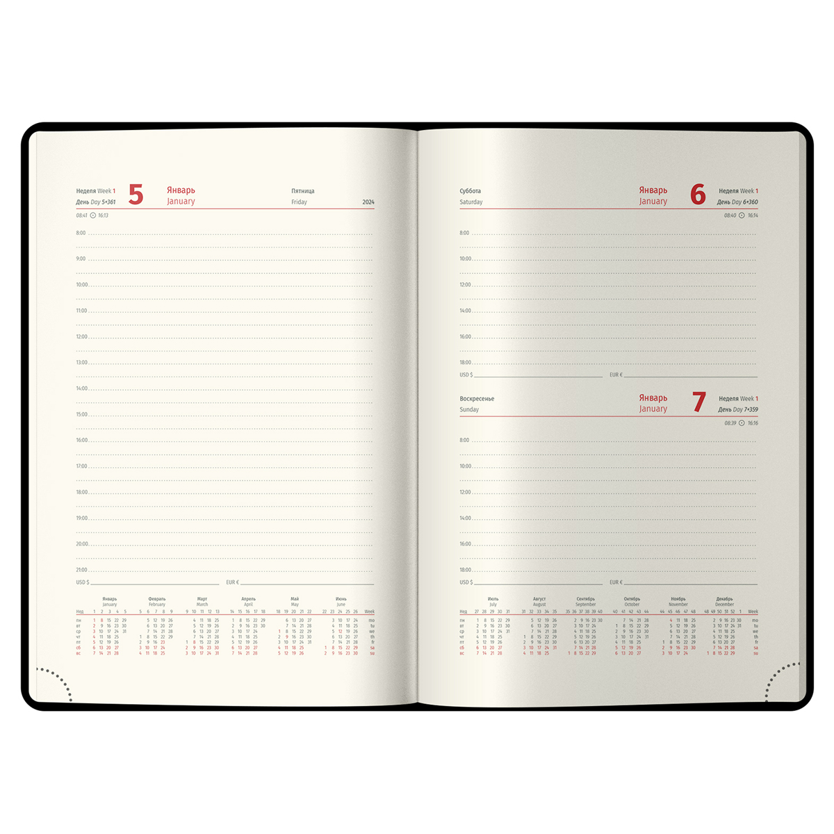 Изделие дополняет срез в цвет обложки. Внутренний блок состоит из 184 листов высококачественной кремовой бумаги повышенной плотности 80 г/м² с пантонной печатью в 2 краски. Размер ежедневника − 145*205 мм.