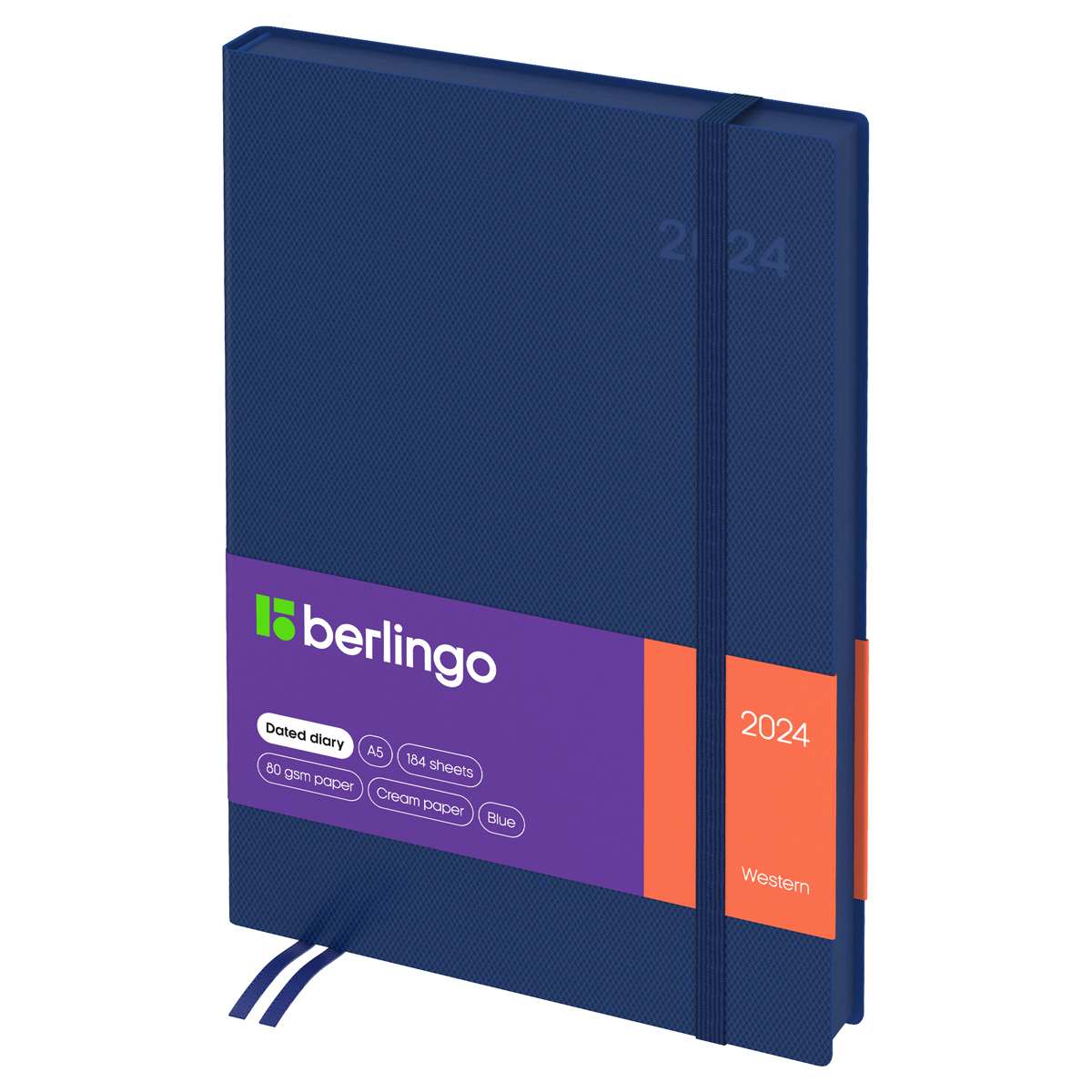 Стильный датированный ежедневник на 2024 год Berlingo Western формата А5 с интегральной обложкой из высококачественной экокожи синего цвета и тиснением под карбон станет отличным помощником в планировании.<br/>Изделие дополняет срез в цвет обложки. Внутренний блок состоит из 184 листов высококачественной кремовой бумаги повышенной плотности 80 г/м² с пантонной печатью в 2 краски. Размер ежедневника − 145*205 мм.<br/>Перфорированные уголки, вертикальная фиксирующая резинка, справочная информация и 2 закладки-ляссе сделают использование ежедневника Berlingo Western комфортным. Внутри располагаются отрывные заметки, бланки извещения о ДТП и справочные материалы. 3 комплекта брендированных стикеров станут приятным подарком.<br/>Датированный ежедневник подходит под персонализацию. Изделие помещено в индивидуальную упаковку, что гарантирует его целостность и сохранность.<br/>• Формат: A5;<br/>• Размер: 145*205 мм;<br/>• Количество листов: 184;<br/>• Материал обложки: экокожа;