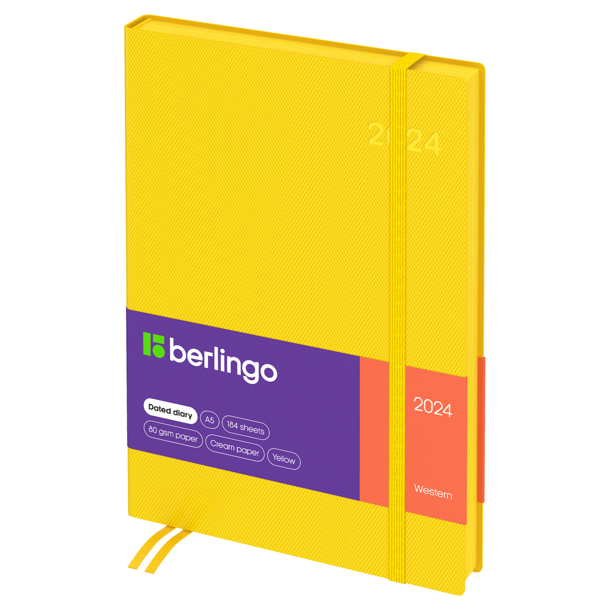 Стильный датированный ежедневник на 2024 год Berlingo Western формата А5 с интегральной обложкой из высококачественной экокожи жёлтого цвета и тиснением под карбон станет отличным помощником в планировании.<br/>Изделие дополняет срез в цвет обложки. Внутренний блок состоит из 184 листов высококачественной кремовой бумаги повышенной плотности 80 г/м² с пантонной печатью в 2 краски. Размер ежедневника − 145*205 мм.<br/>Перфорированные уголки, вертикальная фиксирующая резинка, справочная информация и 2 закладки-ляссе сделают использование ежедневника Berlingo Western комфортным. Внутри располагаются отрывные заметки, бланки извещения о ДТП и справочные материалы. 3 комплекта брендированных стикеров станут приятным подарком.<br/>Датированный ежедневник подходит под персонализацию. Изделие помещено в индивидуальную упаковку, что гарантирует его целостность и сохранность.<br/>• Формат: A5;<br/>• Размер: 145*205 мм;<br/>• Количество листов: 184;<br/>• Материал обложки: экокожа;