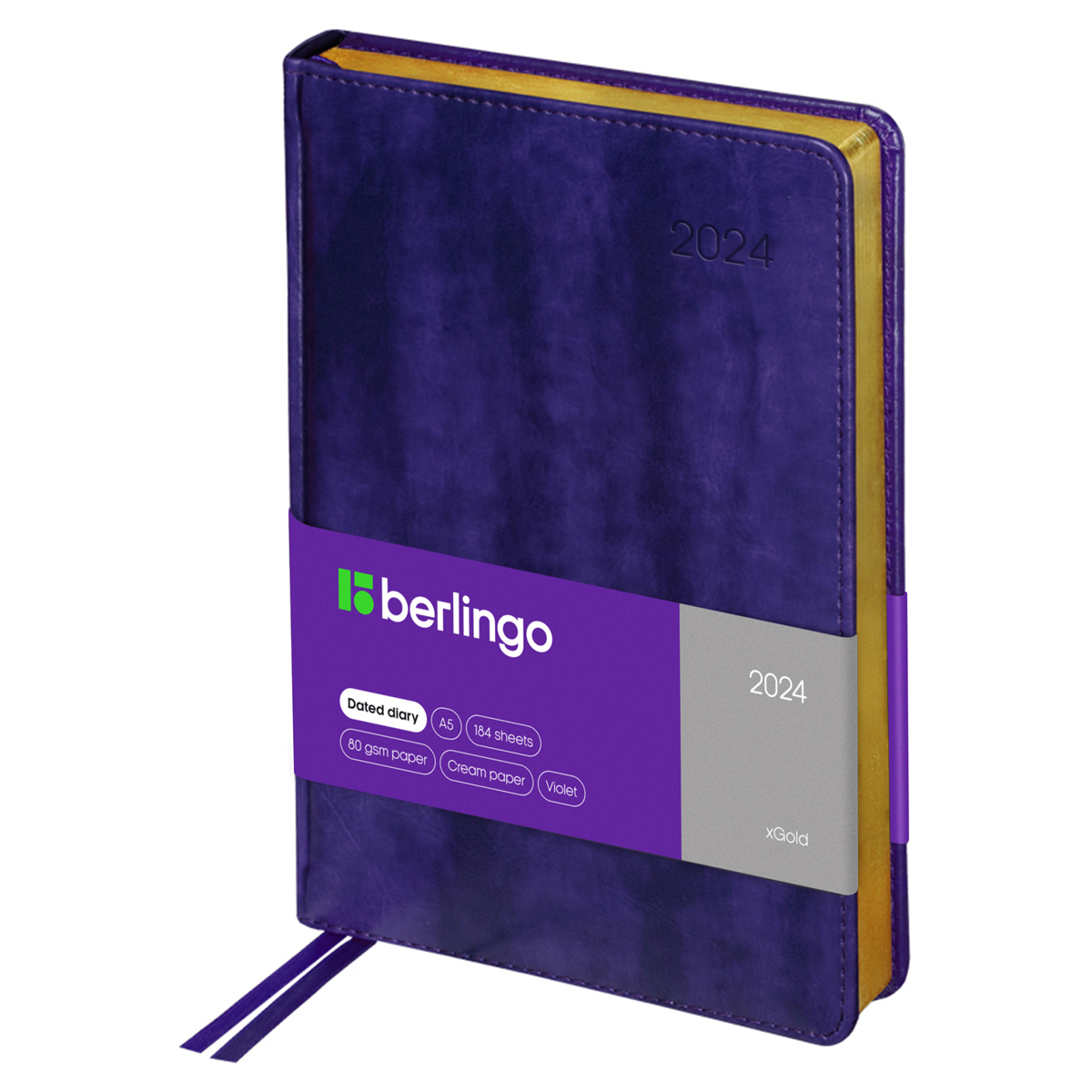 Датированный ежедневник на 2024 год Berlingo xGold формата А5 (150*215 мм) станет стильным помощником в планировании. Фиолетовая обложка с поролоновой прослойкой изготовлена из глянцевой рельефной экокожи, имитирующей кожу первоклассной выделки. Её дизайн дополняет золотой фольгированный срез внутреннего блока из 184 листов высококачественной кремовой бумаги повышенной плотности 80 г/м2 с пантонной печатью в 2 краски. На обложке есть печать года. Перфорированные уголки блока, отрывные заметки и 2 закладки-ляссе обеспечивают комфорт при использовании ежедневника. Внутри изделия есть полезный справочный материал и бланки-извещения о ДТП. В подарок 3 комплекта креативных брендированных стикеров.<br/>• Формат: А5;<br/>• Размер: 150*215 мм;<br/>• Количество листов: 184;<br/>• Материал обложки: экокожа.