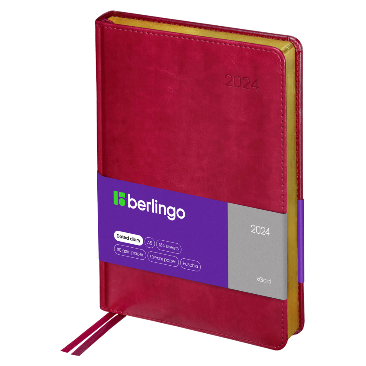 Датированный ежедневник на 2024 год Berlingo xGold формата А5 (150*215 мм) станет стильным помощником в планировании. Обложка цвета фуксия с поролоновой прослойкой изготовлена из глянцевой рельефной экокожи, имитирующей кожу первоклассной выделки. Её дизайн дополняет золотой фольгированный срез внутреннего блока из 184 листов высококачественной кремовой бумаги повышенной плотности 80 г/м2 с пантонной печатью в 2 краски. На обложке есть печать года. Перфорированные уголки блока, отрывные заметки и 2 закладки-ляссе обеспечивают комфорт при использовании ежедневника. Внутри изделия есть полезный справочный материал и бланки-извещения о ДТП. В подарок 3 комплекта креативных брендированных стикеров.<br/>• Формат: А5;<br/>• Размер: 150*215 мм;<br/>• Количество листов: 184;<br/>• Материал обложки: экокожа.