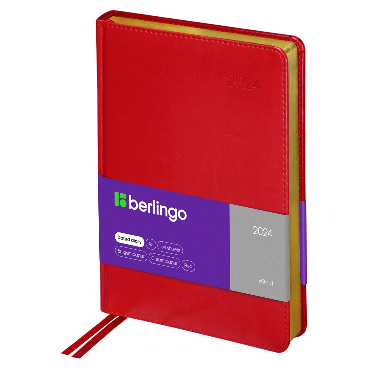 Датированный ежедневник на 2024 год Berlingo xGold формата А5 (150*215 мм) станет стильным помощником в планировании. Красная обложка с поролоновой прослойкой изготовлена из глянцевой рельефной экокожи, имитирующей кожу первоклассной выделки. Её дизайн дополняет золотой фольгированный срез внутреннего блока из 184 листов высококачественной кремовой бумаги повышенной плотности 80 г/м2 с пантонной печатью в 2 краски. На обложке есть печать года. Перфорированные уголки блока, отрывные заметки и 2 закладки-ляссе обеспечивают комфорт при использовании ежедневника. Внутри изделия есть полезный справочный материал и бланки-извещения о ДТП. В подарок 3 комплекта креативных брендированных стикеров.<br/>• Формат: А5;<br/>• Размер: 150*215 мм;<br/>• Количество листов: 184;<br/>• Материал обложки: экокожа.