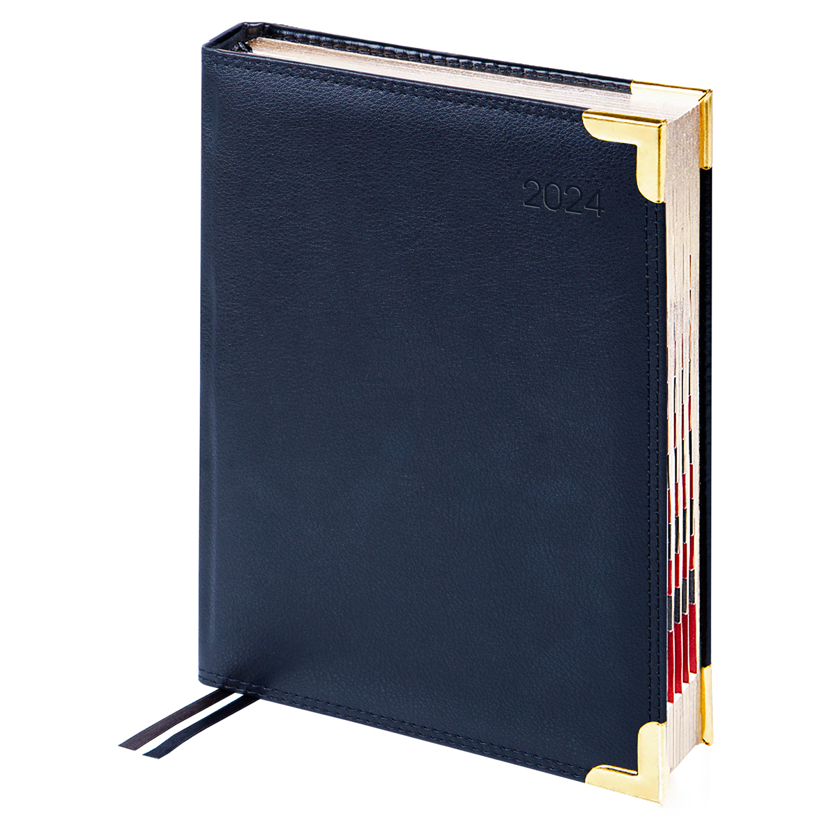 Изысканный датированный ежедневник на 2024 год Delucci формата А6 (115*160 мм) − элегантный помощник для планирования. Обложка ежедневника с поролоновой прослойкой изготовлена из премиальной рельефной экокожи, имитирующей кожу первоклассной выделки, и прошита двойной строчкой. Цвет обложки − чёрный. Изделие дополняют золотые металлические уголки и золотой фольгированный срез блока.