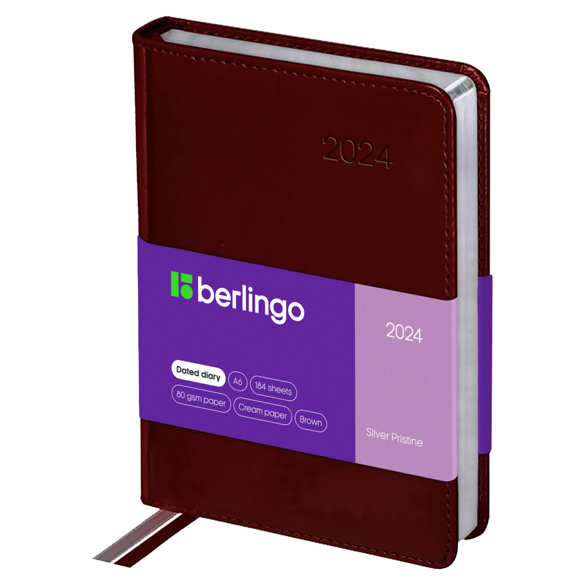 Датированный ежедневник на 2024 год Berlingo Silver Pristine формата А6 (115*160 мм) станет стильным помощником в планировании. Коричневая обложка с поролоновой прослойкой и прострочкой по периметру изготовлена из глянцевой экокожи, имитирующей лакированную кожу первоклассной выделки. Её дизайн дополняет серебряный фольгированный срез внутреннего блока из 184 листов высококачественной кремовой бумаги повышенной плотности 80 г/м2 с пантонной печатью в 2 краски. На обложке есть печать года. Перфорированные уголки блока и 2 закладки-ляссе обеспечивают комфорт при использовании ежедневника. Внутри изделия есть полезный справочный материал. 3 комплекта креативных брендированных стикеров станут приятным подарком.<br/>• Формат: А6;<br/>• Размер: 115*160 мм;<br/>• Количество листов: 184;<br/>• Материал обложки: экокожа.