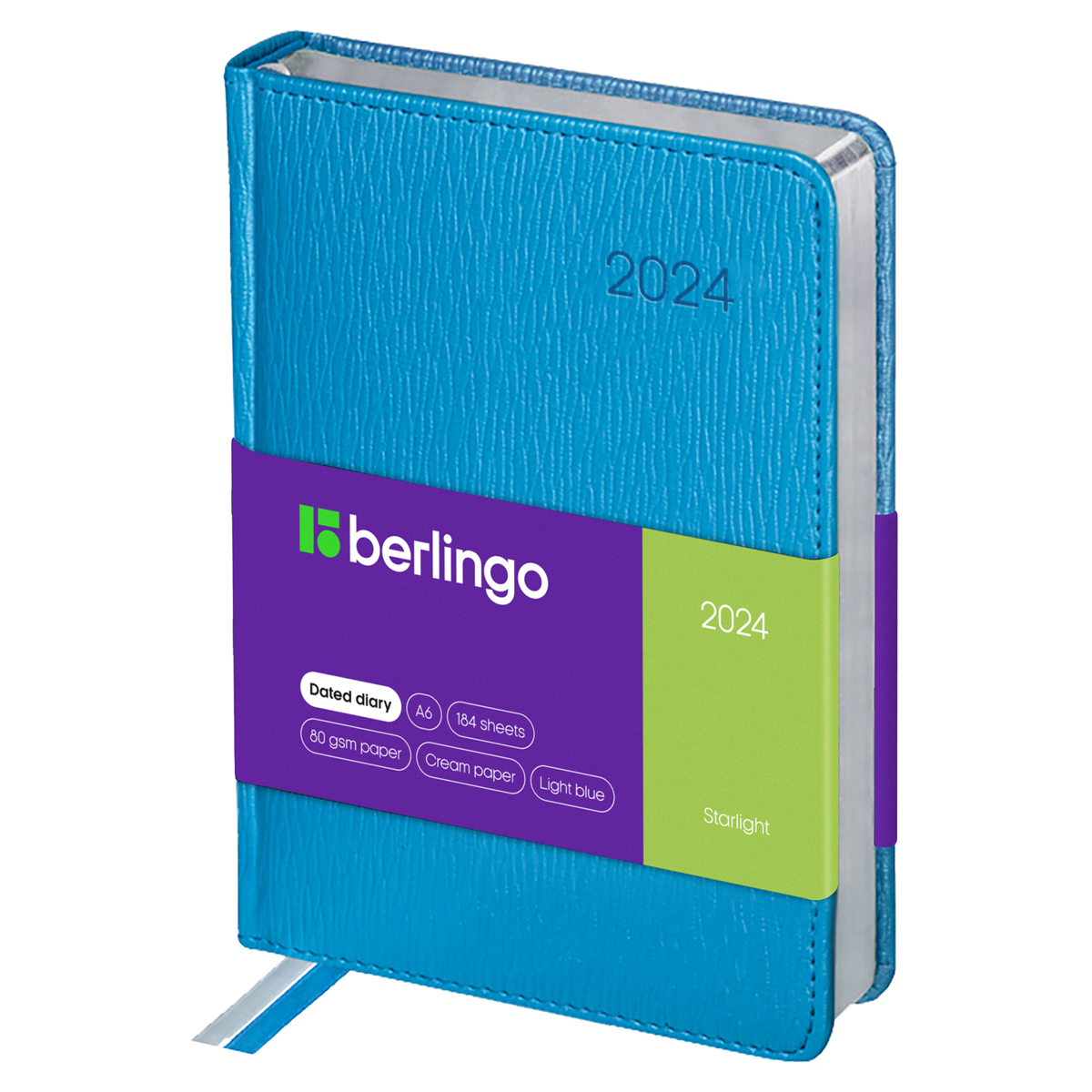 Датированный ежедневник Berlingo Starlight формата А6 (115*160 мм) − стильное решение для планирования. Обложка ежедневника с поролоновой прослойкой и прострочкой по периметру изготовлена из высококачественной экокожи с эффектом блеска и крупной продольной текстурой. Цвет обложки − голубой. Изделие дополняет серебряный фольгированный срез внутреннего блока из 184 листов высококачественной кремовой бумаги повышенной плотности 80 г/м2 с пантонной печатью в 2 краски. Справочный материал, перфорированные уголки блока, отрывные заметки и 2 закладки-ляссе помогут комфортно использовать ежедневник. 3 дополнительных комплекта брендированных стикеров станут отличным подарком. Упакован в термоусадочную плёнку.<br/>• Формат: А6;<br/>• Размер: 115*160 мм;<br/>• Количество листов: 184;<br/>• Материал обложки: экокожа.