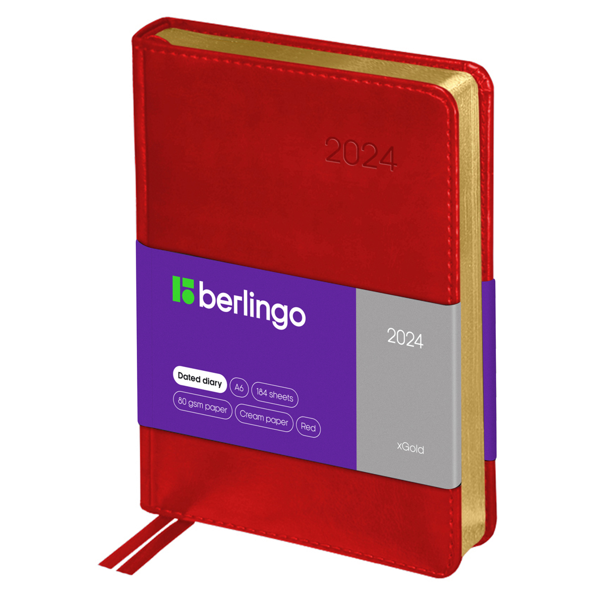 Датированный ежедневник на 2024 год Berlingo xGold формата А6 (115*160 мм) станет стильным помощником в планировании. Красная обложка с поролоновой прослойкой изготовлена из глянцевой рельефной экокожи, имитирующей кожу первоклассной выделки. Её дизайн дополняет золотой фольгированный срез внутреннего блока из 184 листов высококачественной кремовой бумаги повышенной плотности 80 г/м2 с пантонной печатью в 2 краски. На обложке есть печать года. Перфорированные уголки блока, 2 закладки-ляссе и отрывные заметки обеспечивают комфорт при использовании ежедневника. Внутри изделия есть полезный справочный материал. В подарок 3 комплекта креативных брендированных стикеров.<br/>• Формат: А6;<br/>• Размер: 115*160 мм;<br/>• Количество листов: 184;<br/>• Материал обложки: экокожа.