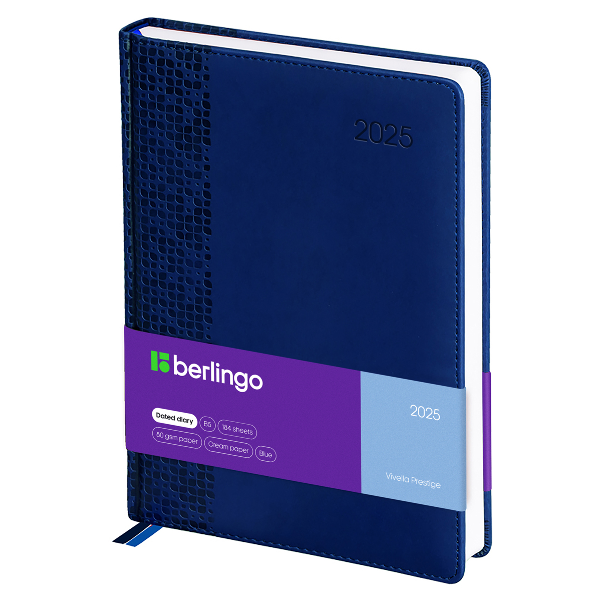 Стильный датированный ежедневник на 2025 год Berlingo Vivella Prestige формата В5 (175*250 мм) с классической твёрдой матовой обложкой из высококачественной экокожи синего цвета. Имиджевое тиснение на обложке добавляет интересную деталь в насыщенной цвет обложки. <br/>Внутренний блок состоит из 184 листов высококачественной кремовой бумаги повышенной плотности 80 г/м² с пантонной печатью в 2 краски. Перфорированные уголки, справочная информация и 2 закладки-ляссе сделают использование ежедневника Berlingo Vivella Prestige комфортным. Внутри располагаются отрывные заметки, бланки извещения о ДТП и справочные материалы. 3 комплекта стикеров станут приятным подарком. Датированный ежедневник подходит под персонализацию. Изделие помещено в индивидуальную упаковку, что гарантирует его целостность и сохранность. <br/>• Формат: В5;<br/>• Размер: 175*250 мм;<br/>• Количество листов: 184;<br/>• Материал обложки: экокожа;<br/>• Цвет обложки: синий.