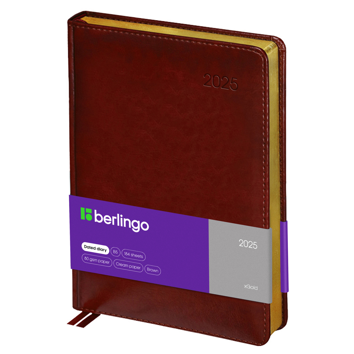 Ежедневники Berlingo xGold изготовлены из глянцевой рельефной экокожи, имитирующей кожу первоклассной выделки. Ежедневник датированный формата B5 (175*250 мм) с обложкой с поролоновой прослойкой. Золотой фольгированный срез блока. 184 листа. Цвет обложки − коричневый. Высококачественная кремовая бумага повышенной плотности 80 г/м2, пантонная печать блока в 2 краски, справочный материал. Перфорированные уголки блока. 2 закладки-ляссе. Отрывные заметки и бланки-извещения о ДТП. В подарок 3 комплекта стикеров.<br/><br/>• Формат: А4-(B5);<br/>• Размер: 175*250 мм;<br/>• Количество листов: 184;<br/>• Материал обложки: экокожа.