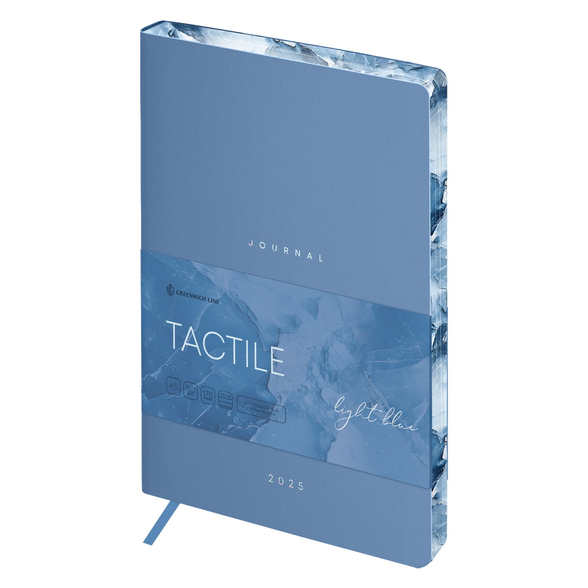 Ежедневник датированный на 2025 год Greenwich Line "Tactile" станет отличным помощником. Благодаря ультрамягкой двухслойной обложке из высококачественной экокожи нежного пастельного оттенка его не захочется выпускать из рук. Ежедневник размером 145*205 мм содержит 176 листов из высококачественной кремовой бумаги повышенной плотности 80 г/м2с пантонной печатью в 2 краски. Содержит справочный материал и имеет закладку-ляссе. Мраморный рисунок среза выполнен в тонах обложки и лаконично дополняет её. Имеет индивидуальную упаковку, что гарантирует его сохранность.<br/>• Формат: А5;<br/>• Размер: 145*205 мм;<br/>• Количество листов: 176;<br/>• Материал обложки: экокожа;<br/>• Цвет обложки: голубой.