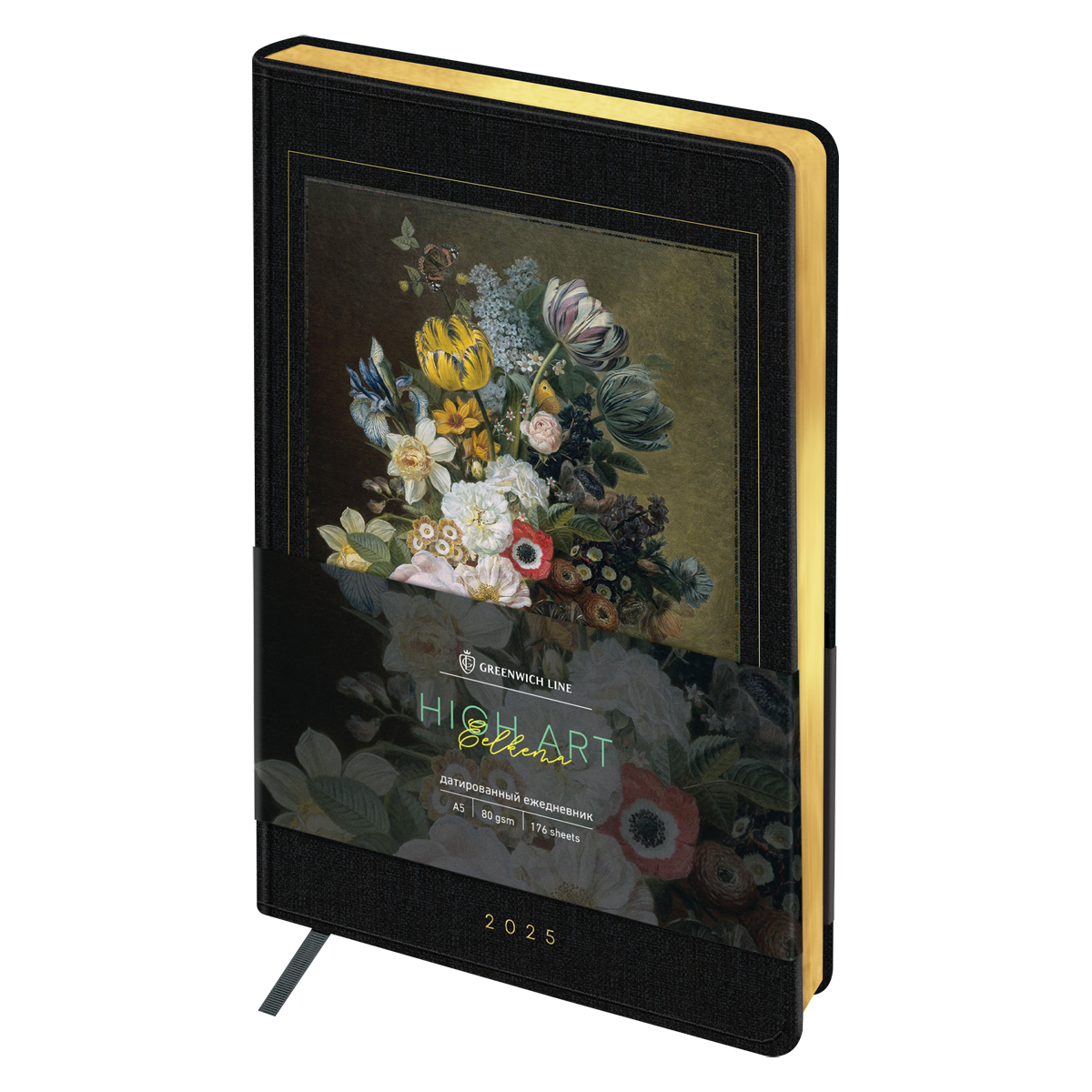 Ежедневник датированный на 2025 год Greenwich Line серии High Art станет отличным помощником. Благодаря обложке из высококачественной экокожи с имитацией под лён его не захочется выпускать из рук. Ежедневник формата А5 размером 145*205 мм содержит 176 листов высококачественной кремовой бумаги повышенной плотности 80 г/м2с пантонной печатью в 2 краски. <br/>Обложка украшена картинами по мотивам известных художников. Золотой срез придает ежедневнику особый шарм.<br/>Содержит справочный материал и имеет закладку-ляссе. Имеет индивидуальную упаковку, что гарантирует его сохранность.<br/>• Формат: А5;<br/>• Размер: 145*205 мм;<br/>• Количество листов: 176;<br/>• Материал обложки: экокожа;<br/>• Цвет обложки: разноцветный.