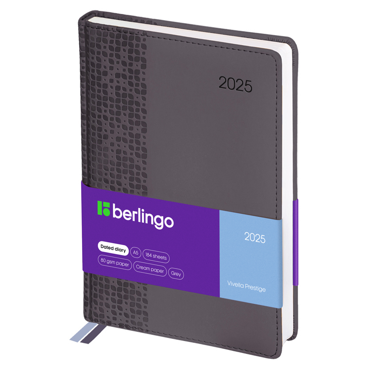 Стильный датированный ежедневник на 2025 год Berlingo Vivella Prestige формата А5 (150*215 мм) с классической твёрдой матовой обложкой из серой высококачественной экокожи. Имиджевое тиснение на обложке добавляет интересную деталь в насыщенной цвет обложки.