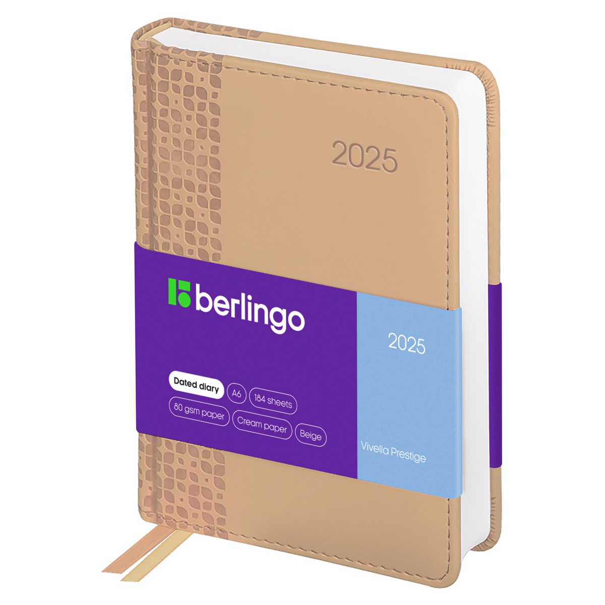 Стильный датированный ежедневник на 2025 год Berlingo Vivella Prestige формата А6 (115*160 мм) с классической твёрдой матовой обложкой из бежевой высококачественной экокожи. Имиджевое тиснение на обложке добавляет интересную деталь в насыщенной цвет обложки. <br/>Внутренний блок состоит из 184 листов высококачественной кремовой бумаги повышенной плотности 80 г/м² с пантонной печатью в 2 краски. Перфорированные уголки, справочная информация и 2 закладки-ляссе сделают использование ежедневника Berlingo Vivella Prestige комфортным. Внутри располагаются отрывные заметки, бланки извещения о ДТП и справочные материалы. 3 комплекта стикеров станут приятным подарком. Датированный ежедневник подходит под персонализацию. Изделие помещено в индивидуальную упаковку, что гарантирует его целостность и сохранность. <br/>• Формат: A6;<br/>• Размер: 115*160 мм;<br/>• Количество листов: 184;<br/>• Материал обложки: экокожа;<br/>• Цвет обложки: бежевый.