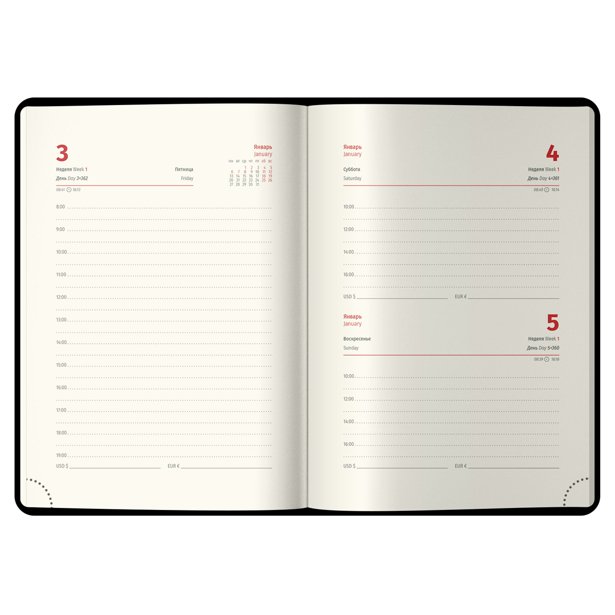 Внутренний блок состоит из 184 листов высококачественной кремовой бумаги повышенной плотности 80 г/м² с пантонной печатью в 2 краски. Перфорированные уголки, справочная информация и 2 закладки-ляссе сделают использование ежедневника Berlingo Vivella Prestige комфортным. Внутри располагаются отрывные заметки, бланки извещения о ДТП и справочные материалы. 3 комплекта стикеров станут приятным подарком. Датированный ежедневник подходит под персонализацию. Изделие помещено в индивидуальную упаковку, что гарантирует его целостность и сохранность.