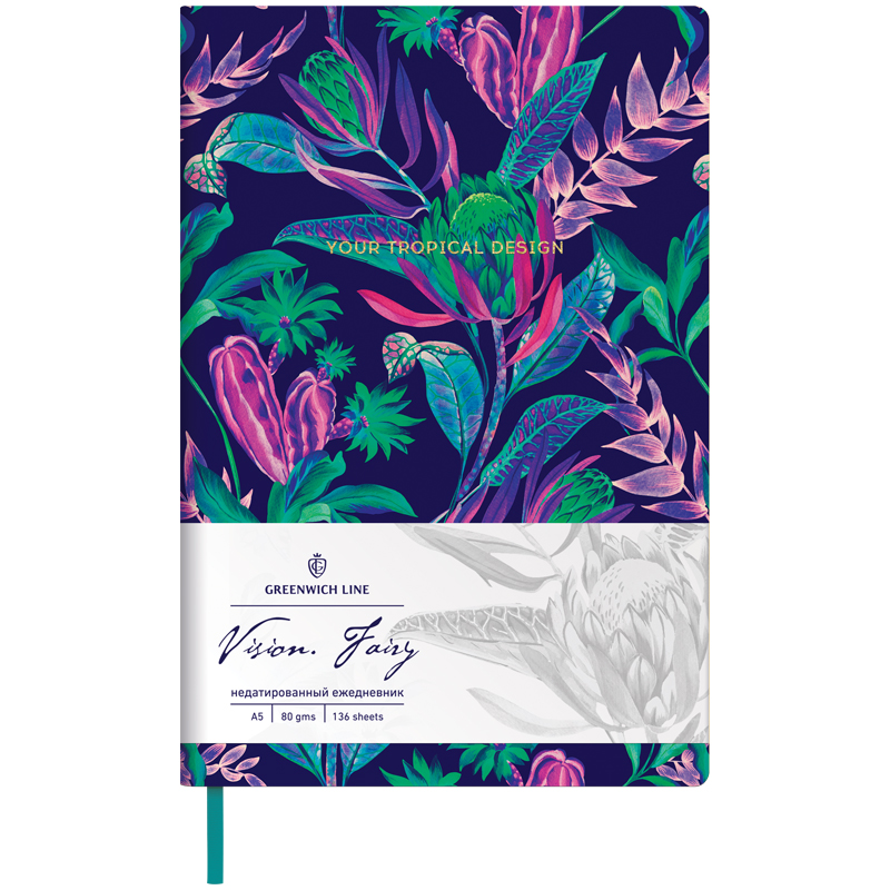 Ежедневник недатированный в мягкой обложке, выполненной из искусственной кожи с ярким и модным принтом, нанесенными УФ-печатью. Внутренний блок из тонированной офсетной бумаги кремового цвета повышенной плотности 80 г/м2