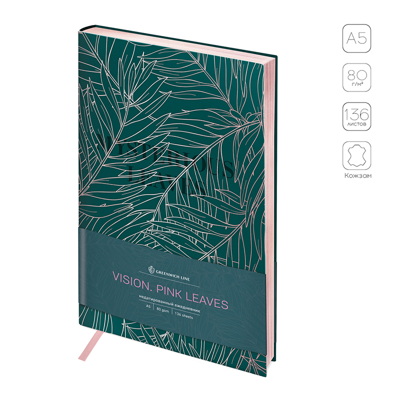 Ежедневник Greenwich Line Vision Pink leaves формата А5 имеет ультрамягкую двухслойную обложку из высококачественной экокожи. Дополняет дизайн срез, отделанный розовой фольгой. Внутренний блок вмещает 136 листов, которые созданы из кремовой бумаги повышенной плотности 80 г/м2 с пантонной печатью в 2 краски. Ежедневник Greenwich Line Vision Pink leaves недатирован и не имеет справочного материала, однако он отлично подходит под персонализацию. <br/>Изделие представлено в размере 143 на 210 мм и имеет стильную закладку-ляссе. Ежедневник упакован в индивидуальную упаковку, что гарантирует его целостность и сохранность. <br/>• Формат: A5;<br/>• Размер: 143*210 мм;<br/>• Количество листов: 136;<br/>• Материал обложки: экокожа;<br/>• Цвет обложки: с рисунком.