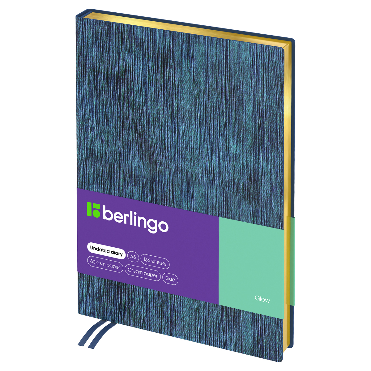 Оригинальный недатированный ежедневник Berlingo Glow формата А5 идеально подойдет в качестве подарка. Золотой фольгированный срез красиво подчеркивает синий фактурный цвет интегральной обложки из экокожи с продольной текстурой. Внутренний блок состоит из 136 листов высококачественной кремовой бумаги повышенной плотности 80 г/м² с пантонной печатью в 2 краски. Размер недатированного ежедневника – 143*210 мм.<br/>Перфорированные уголки листов и 2 закладки-ляссе сделают использование ежедневника Berlingo Glow комфортным. Внутри располагаются: географическая карта, отрывные заметки, бланки извещения о ДТП и справочные материалы. Ежедневник подходит под персонализацию, а 3 комплекта стикеров станут приятным подарком.<br/>• Формат: A5;<br/>• Размер: 143*210 мм;<br/>• Количество листов: 136;<br/>• Материал обложки: экокожа;<br/>• Цвет обложки: синий.