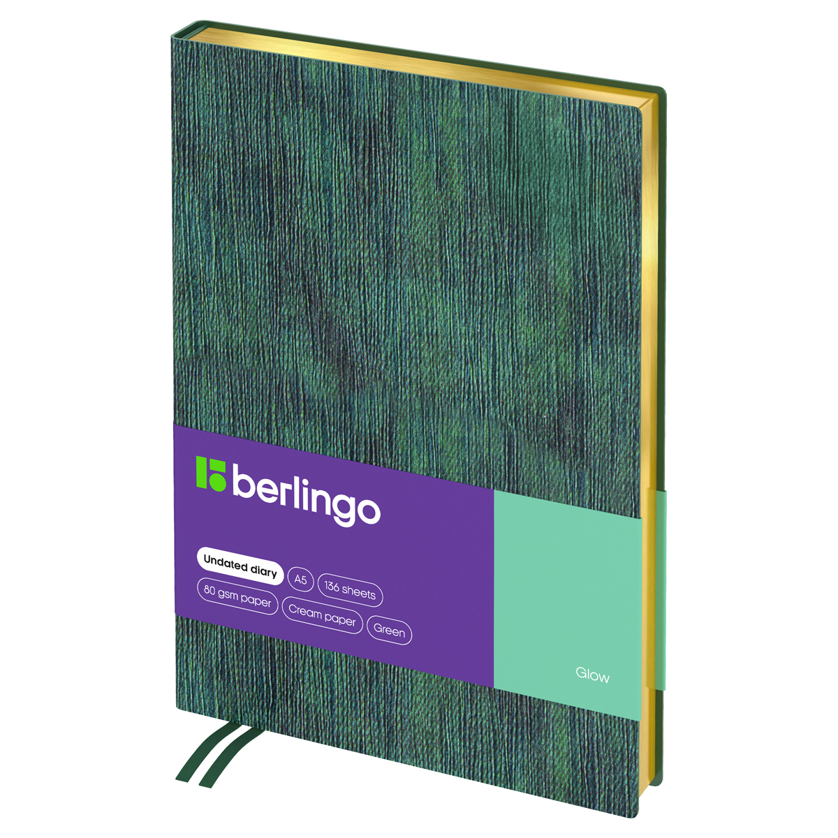 Оригинальный недатированный ежедневник Berlingo Glow формата А5 идеально подойдет в качестве подарка. Золотой фольгированный срез красиво подчеркивает зелёный фактурный цвет интегральной обложки из экокожи с продольной текстурой. Внутренний блок состоит из 136 листов высококачественной кремовой бумаги повышенной плотности 80 г/м² с пантонной печатью в 2 краски. Размер недатированного ежедневника – 143*210 мм.<br/>Перфорированные уголки листов и 2 закладки-ляссе сделают использование ежедневника Berlingo Glow комфортным. Внутри располагаются: географическая карта, отрывные заметки, бланки извещения о ДТП и справочные материалы. Ежедневник подходит под персонализацию, а 3 комплекта стикеров станут приятным подарком.<br/>• Формат: A5;<br/>• Размер: 143*210 мм;<br/>• Количество листов: 136;<br/>• Материал обложки: экокожа;<br/>• Цвет обложки: зеленый.