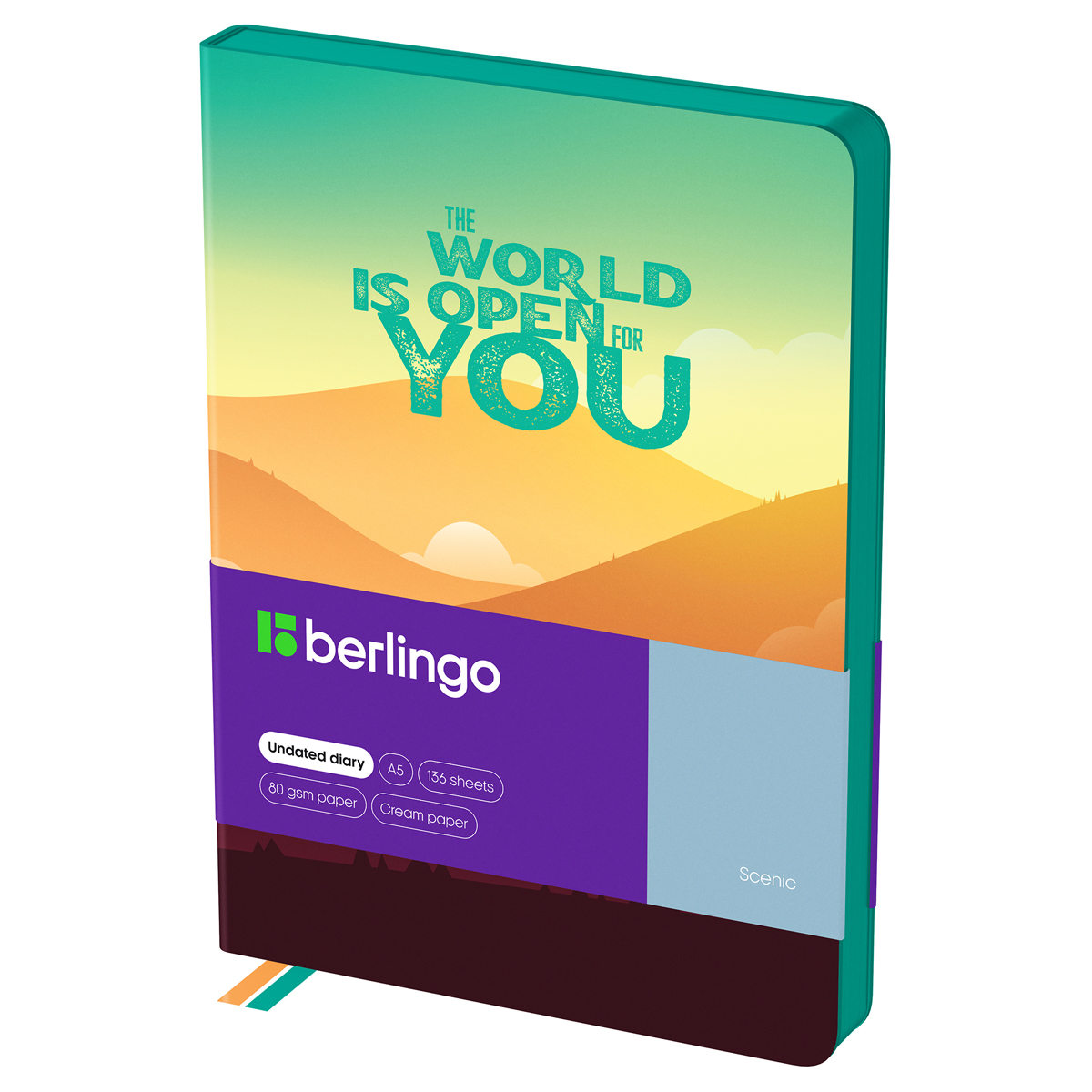Стильный недатированный ежедневник Berlingo Scenic формата A5 имеет мятный контрастный срез и ультрамягкую обложку из высококачественной экокожи. Изделие выполнено в ярком дизайне коллекционной серии Berlingo Scenic. Внутренний блок состоит из 136 листов высококачественной кремовой бумаги повышенной плотности 80 г/м² с пантонной печатью в 2 краски. Представлен в размере 143*210 мм.<br/><br/>Перфорированные уголки, справочная информация и 2 закладки-ляссе сделают использование ежедневника комфортным. Внутри есть отрывные заметки, бланки извещения о ДТП и справочные материалы. Недатированный прошитый ежедневник Berlingo подходит под персонализацию. 3 комплекта стикеров станут приятным подарком.<br/>• Формат: A5;<br/>• Размер: 143*210 мм;<br/>• Количество листов: 136;<br/>• Материал обложки: экокожа;<br/>• Цвет обложки: рисунок.