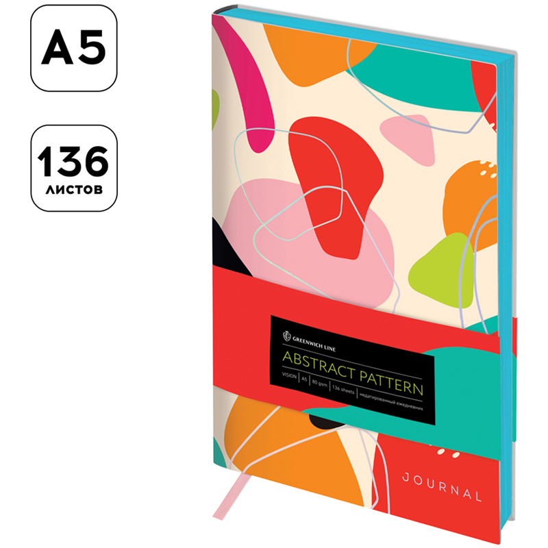 Ежедневник Greenwich Line Vision. Abstract pattern − отличный помощник и незаменимый атрибут деловой жизни. Внутренний блок ежедневника формата A5 вмещает 136 листов, которые созданы из высококачественной кремовой бумаги повышенной плотности 80 г/м², а благодаря ультрамягкой двухслойной обложке из высококачественной экокожи изделие не захочется выпускать из рук. Ежедневник содержит справочный материал, имеет стильную закладку-ляссе и отлично подходит под персонализацию. Индивидуальная упаковка изделия гарантирует его целостность и сохранность.<br/>• Формат: А5;<br/>• Размер: 143*210 мм;<br/>• Материал обложки: искусственная кожа;<br/>• Цвет обложки: рисунок.