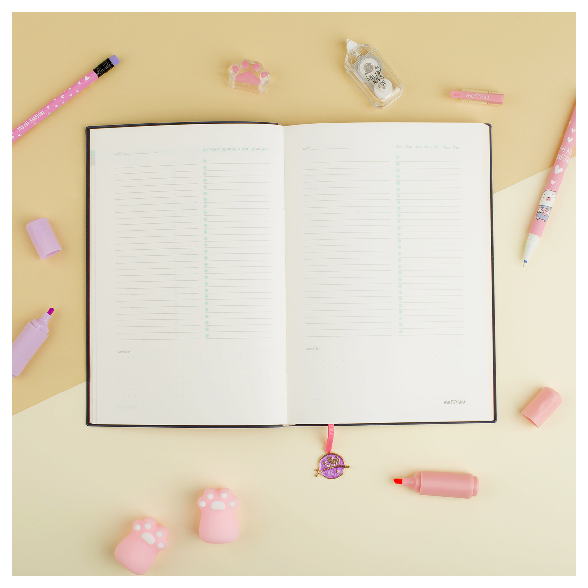 Недатированный ежедневник MESHU "Find your way. Pink" формата А5 — отличный помощник для тех, кто ценит своё время. Размер изделия — 143*210 мм. Внутренний блок состоит из 136 листов кремовой бумаги повышенной плотности 80 г/м². Ежедневник содержит справочные материалы. Обложка сделана из ультрамягкой экокожи. Дизайн подчёркивают закладка-ляссе с подвеской и отделка глиттером.
