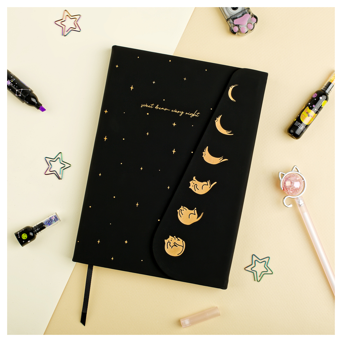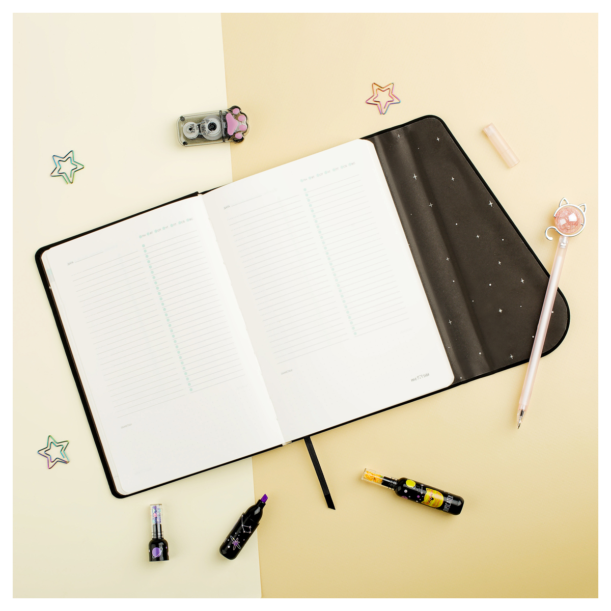 Недатированный ежедневник MESHU "Growing cat" формата А5 — отличный помощник для тех, кто ценит своё время. Размер изделия — 143*210 мм. Внутренний блок состоит из 136 листов кремовой бумаги повышенной плотности 80 г/м². Ежедневник содержит справочные материалы. Обложка с магнитным клапаном сделана из экокожи. Дизайн подчёркивают закладка-ляссе и отделка — тиснение фольгой.