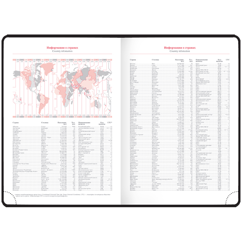 Перфорированные уголки и закладка-ляссе обеспечат комфорт и удобство при использовании ежедневника. Внутри на форзацах содержатся географические карты России и мира и справочные материалы. Недатированный ежедневник подходит под персонализацию.