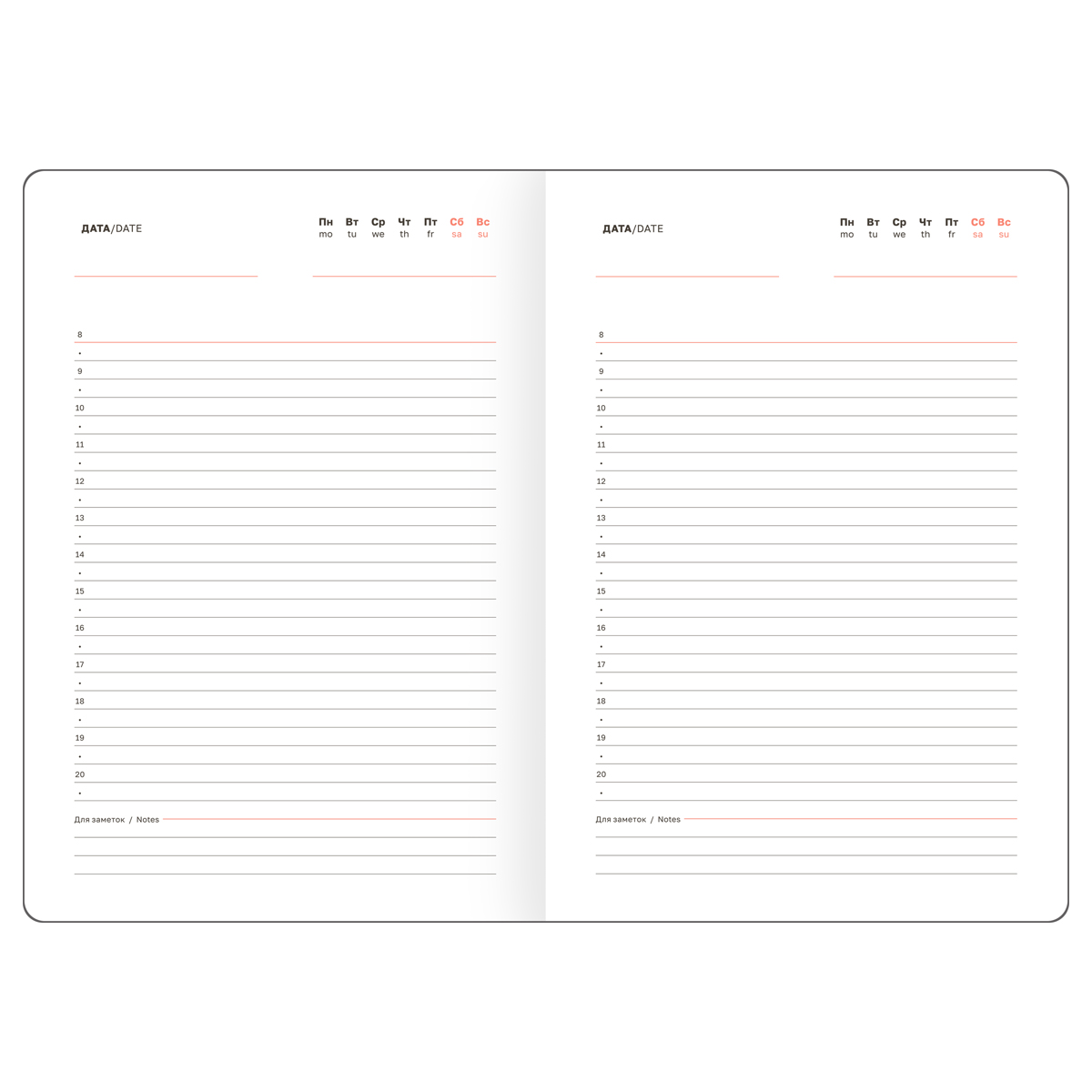 Изделие состоит из 136 листов белой бумаги плотностью 70 г/м2, которая подходит для любых типов ручек и не будет просвечиваться. В линованный блок с полем для даты и почасовым планингом удобно записывать встречи, идеи и задачи.