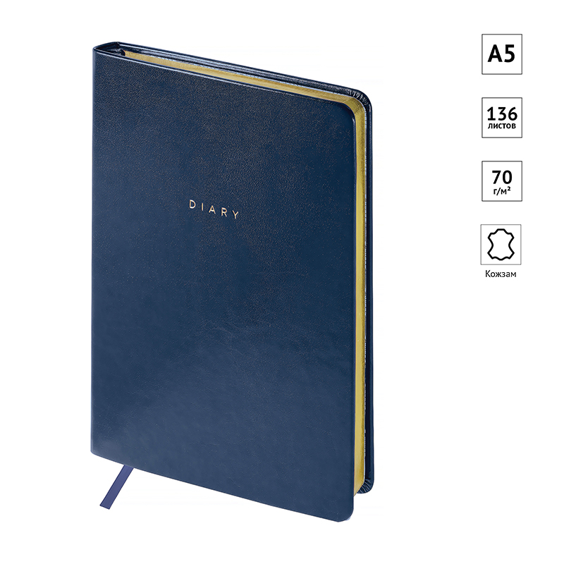 Недатированный ежедневник OfficeSpace формата А5 серии Windsor в твёрдой обложке синего цвета, выполненной из высококачественного кожзаменителя с золотой надписью, отлично подойдет тем, кто предпочитает классику в дизайне и комфорт в деталях. Внутренний блок состоит из 136 листов офсетной тонированной бумаги плотностью 70 г/м2 и печатью в 2 краски. Недатированный ежедневник представлен в размере 145*205 мм.<br/> Закладка-ляссе обеспечит комфорт и удобство при использовании ежедневника. Внутри есть удобный карман для визиток, карточек, записок. Недатированный ежедневник подходит под персонализацию. <br/>• Формат: А5;<br/>• Размер: 145*205 мм;<br/>• Количество листов: 136;<br/>• Материал обложки: экокожа; <br/>• Цвет обложки: синий.<br/><br/>Причина уценки: нетоварный вид. Белая этикетка на корпусе.