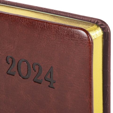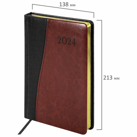 Внутренний блок включает 168 листов тонированной бумаги плотностью 70 г/м2. Каждая страничка имеет перфорированный угол. Благодаря стандартному формату А5 (138х213 мм) ежедневник удобно использовать как в офисе, так и на выездных деловых встречах. Твердая обложка состоит из двух материалов и стилизована под кожу крокодила в сочетании с гладкой кожей. Подходит для горячего тиснения. Срез ежедневника фольгирован золотой фольгой, что придает ему особый шарм.