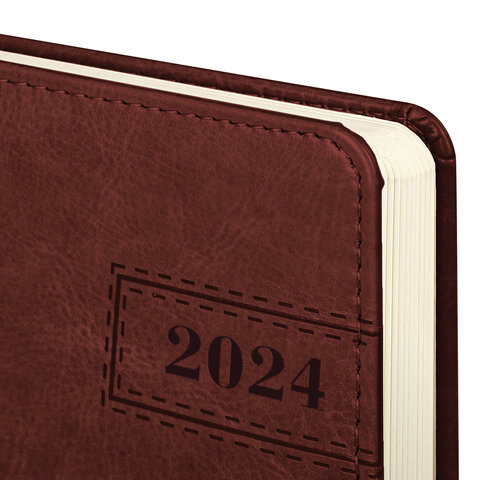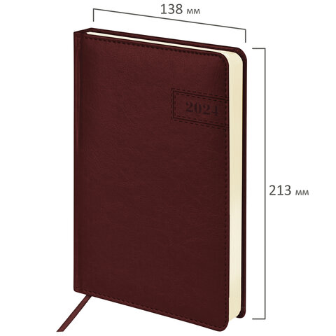 Внутренний блок включает 168 листов тонированной бумаги плотностью 70 г/м2. Каждая страничка имеет перфорированный угол. Благодаря стандартному формату А5 (138х213 мм) датированный ежедневник удобно использовать как в офисе, так и на выездных деловых встречах. Твердая обложка стилизована под гладкую кожу классического коричневого цвета. Материал обложки подходит для горячего тиснения. Дополнением является закладка-ляссе, с помощью которой при необходимости можно быстро открыть ежедневник на нужной странице. Помимо прочего, ежедневник снабжен обширным справочным материалом.