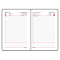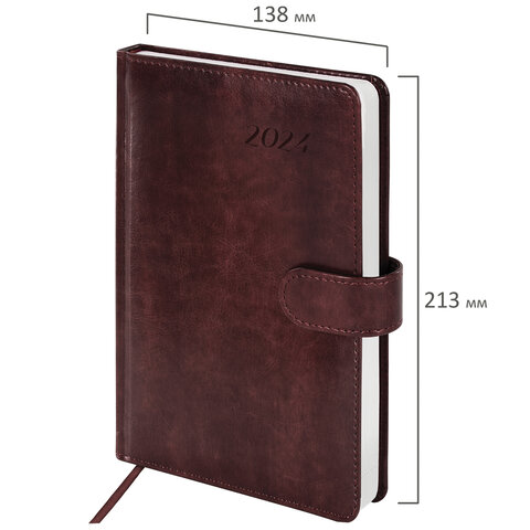Внутренний блок включает 168 листов белой бумаги плотностью 70 г/м2. Каждая страничка имеет перфорированный угол. Благодаря стандартному формату А5 (138х213 мм) датированный ежедневник удобно использовать как в офисе, так и на выездных деловых встречах. Жесткая книжная обложка, прошитая по периметру, с легкой рельефной фактурой, напоминающей натуральную кожу, фиксируется магнитной застежкой, поэтому ежедневник не откроется в сумке или портфеле и страницы не помнутся.