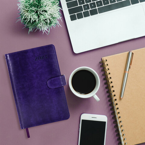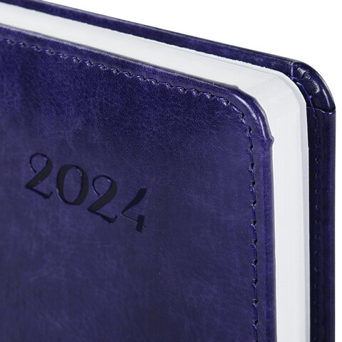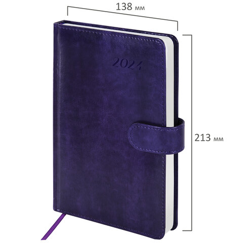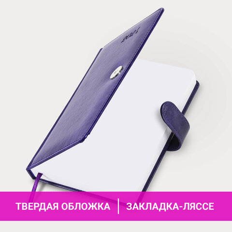 Внутренний блок включает 168 листов белой бумаги плотностью 70 г/м2. Каждая страничка имеет перфорированный угол. Благодаря стандартному формату А5 (138х213 мм) датированный ежедневник удобно использовать как в офисе, так и на выездных деловых встречах. Жесткая книжная обложка, прошитая по периметру, с легкой рельефной фактурой, напоминающей натуральную кожу, фиксируется магнитной застежкой, поэтому ежедневник не откроется в сумке или портфеле и страницы не помнутся. Материал обложки подходит для горячего тиснения. Дополнением является закладка-ляссе, с помощью которой при необходимости можно быстро открыть ежедневник на нужной странице. Помимо прочего, ежедневник снабжен обширным справочным материалом. Выполнен в благородном фиолетовом цвете.